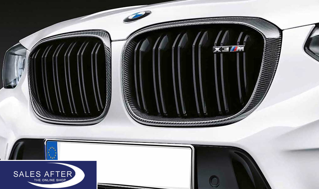 Die serienmäßig verchromten Frontziergitter können gegen Carbon Ziergitter ausgetauscht werden. Die markanten Doppelzierstreben sorgen für die Original X3M Optik.